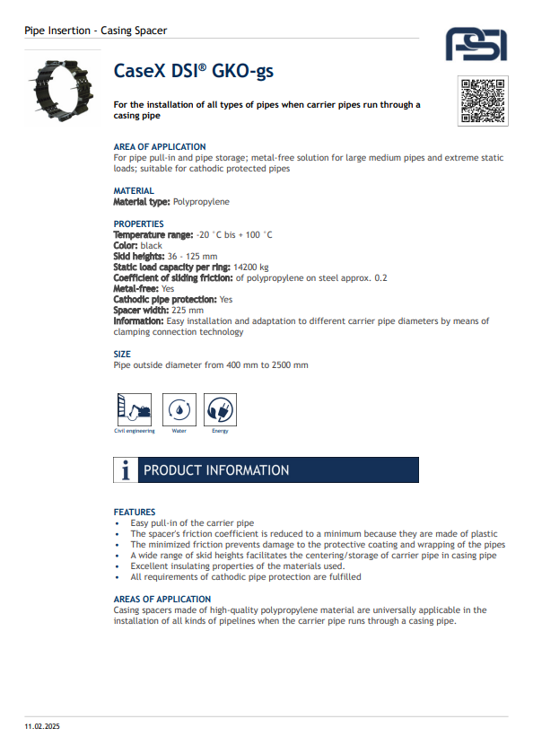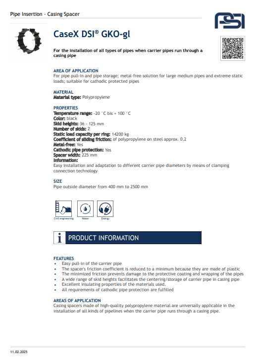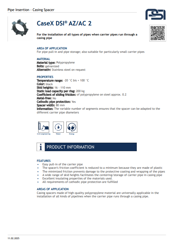 The CaseX® DSIR Casing Spacer is designed to support and center carrier pipes inside casings, ensuring corrosion protection and easy installation. Made from high-strength, non-metallic materials, it prevents metal-to-metal contact and accommodates various pipe sizes. Ideal for pipeline crossings and utility projects, it offers durability, chemical resistance, and long service life.