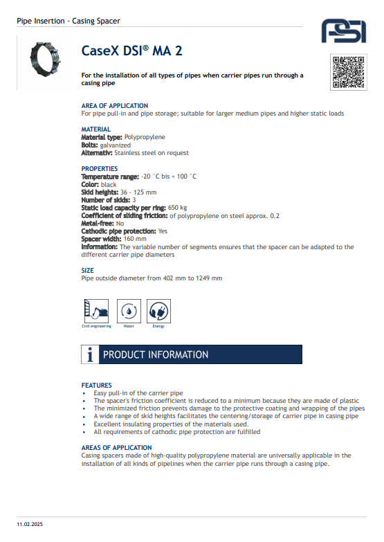 The CaseX® DSIR Casing Spacer is designed to support and center carrier pipes inside casings, ensuring corrosion protection and easy installation. Made from high-strength, non-metallic materials, it prevents metal-to-metal contact and accommodates various pipe sizes. Ideal for pipeline crossings and utility projects, it offers durability, chemical resistance, and long service life.