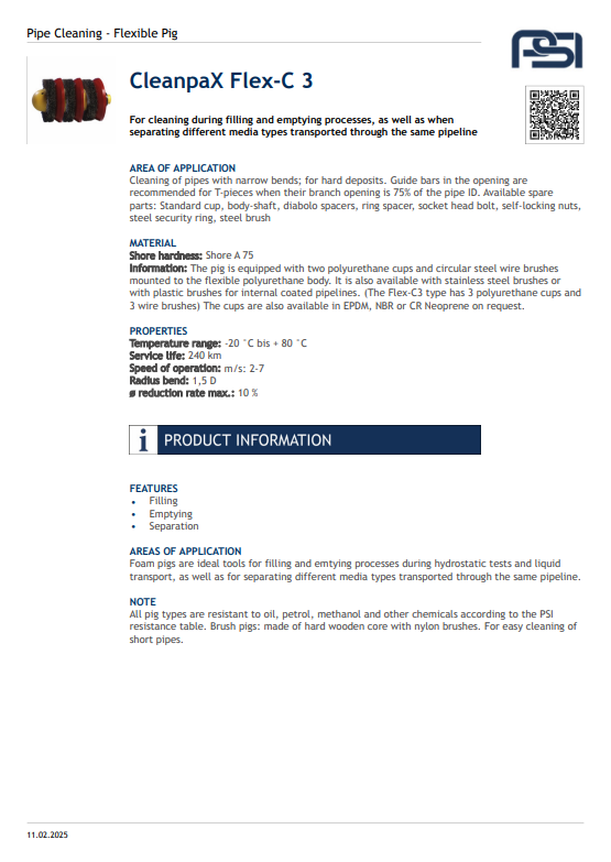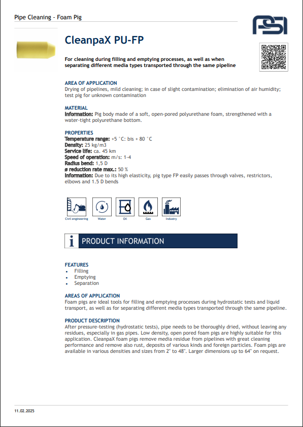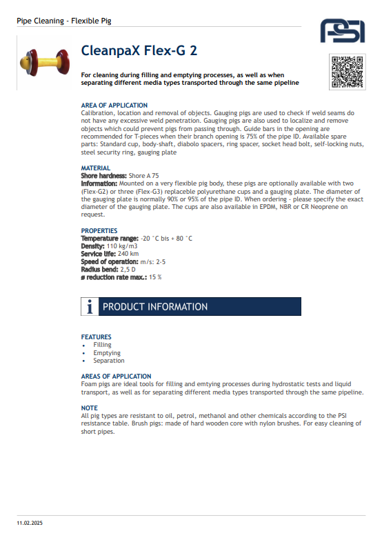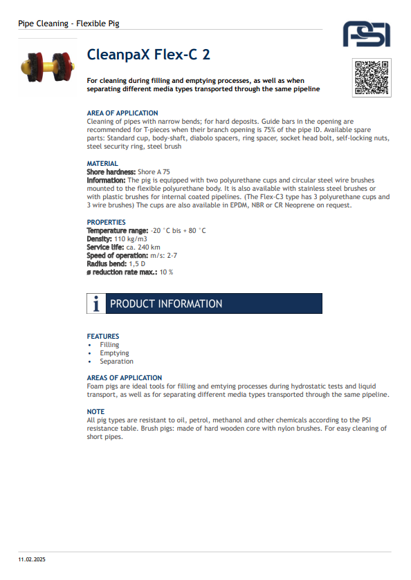 The CleanPax Flexible Pig is designed for efficient and reliable cleaning of pipelines across various industrial applications. Its flexible construction allows it to navigate bends and diameter changes with ease, ensuring thorough removal of deposits, debris, and residues without damaging the pipe interior. Engineered for versatility and durability, this solution is perfect for industries requiring high standards of cleanliness and productivity.