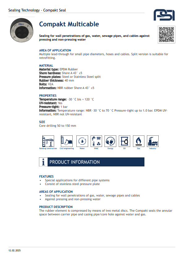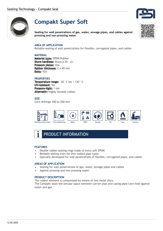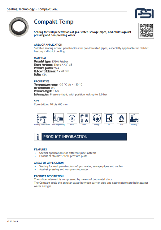 The Compakt Seal provides a secure, pressure-tight seal for annular spaces between carrier pipes and casing pipes or core holes. Its wide rubber element is compressed by two metal discs, ensuring reliable protection against water and gas ingress. Designed for durability and ease of installation, it offers long-term performance in demanding environments.