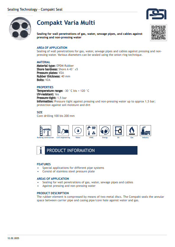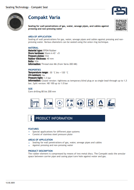 The Compakt Seal provides a secure, pressure-tight seal for annular spaces between carrier pipes and casing pipes or core holes. Its wide rubber element is compressed by two metal discs, ensuring reliable protection against water and gas ingress. Designed for durability and ease of installation, it offers long-term performance in demanding environments.