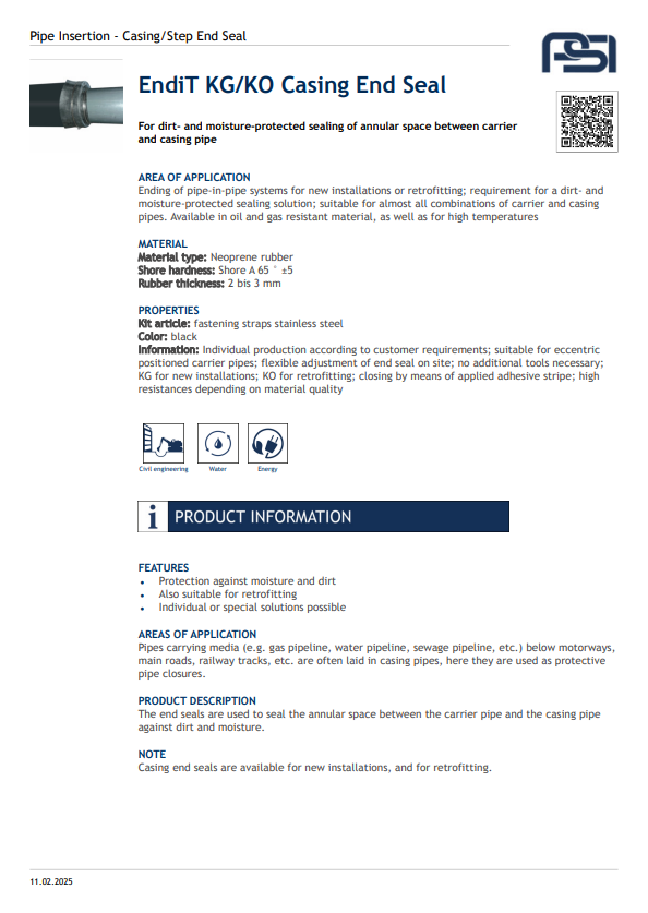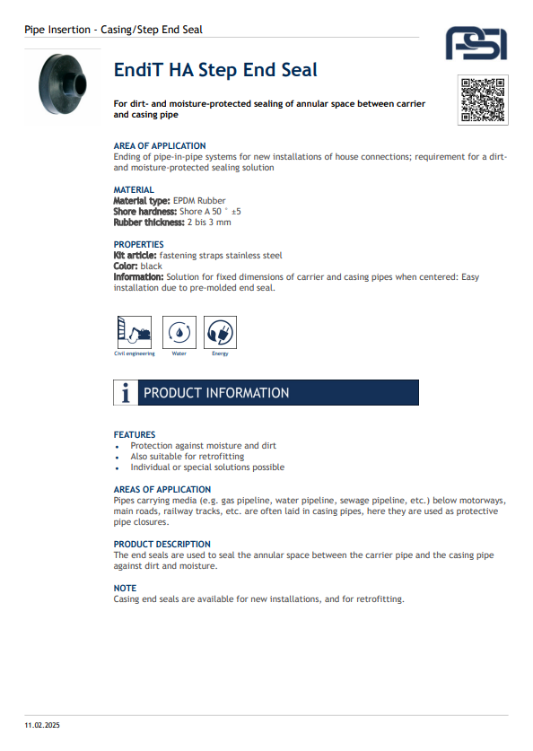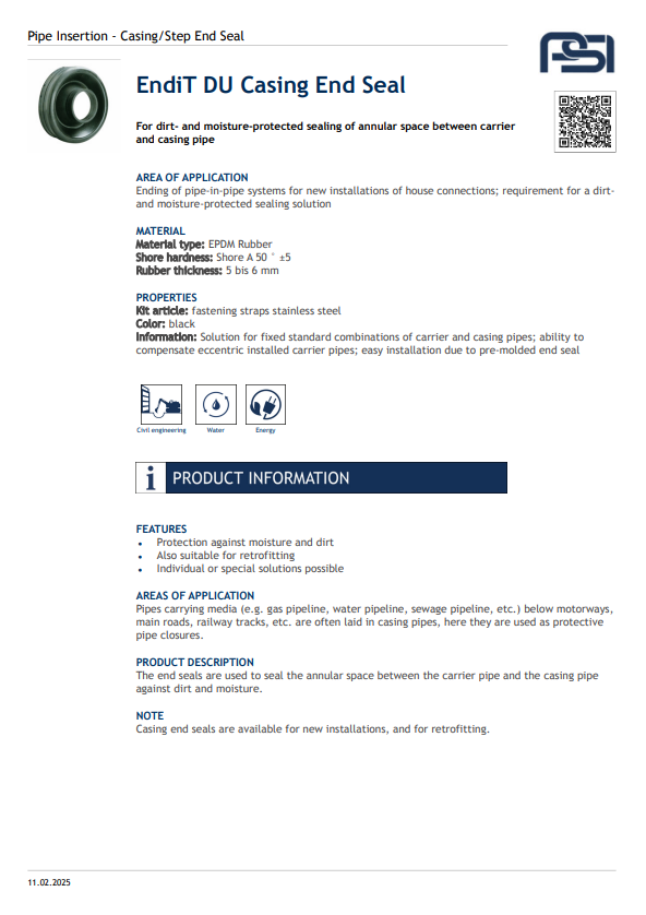 The Endit® Casing Step End Seal provides a secure, watertight seal for the ends of casing pipes, preventing soil, water, and debris ingress. Made from durable elastomer materials, it accommodates pipe movement and ensures long-term protection against corrosion. Easy to install without special tools, it’s ideal for pipeline crossings and utility applications.