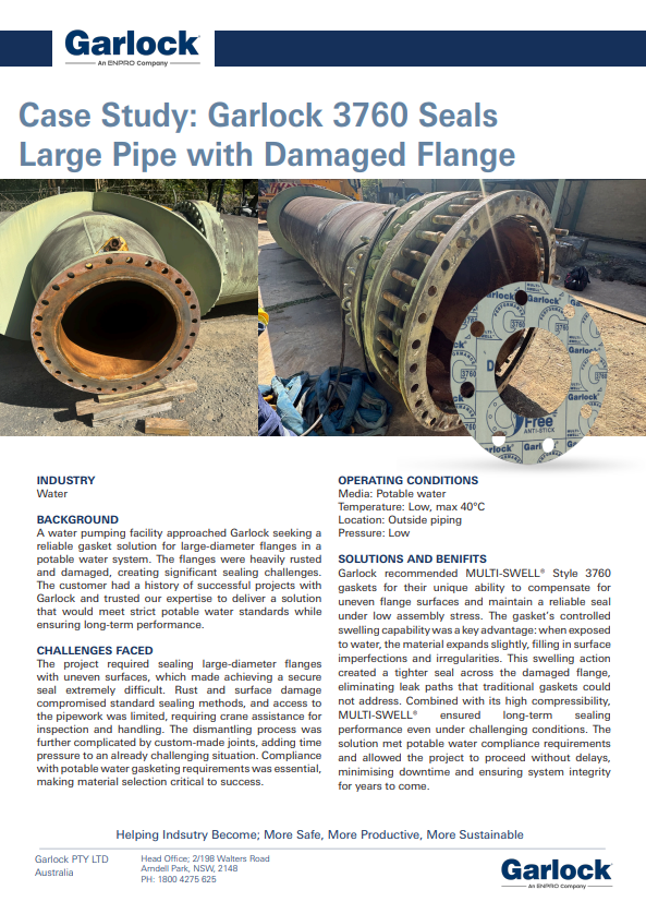 A fluid-activated gasket material that swells to improve sealing in water and oil applications. Ideal for low bolt load systems, it offers excellent conformability and leak prevention. NSF 61 certified for potable water use.