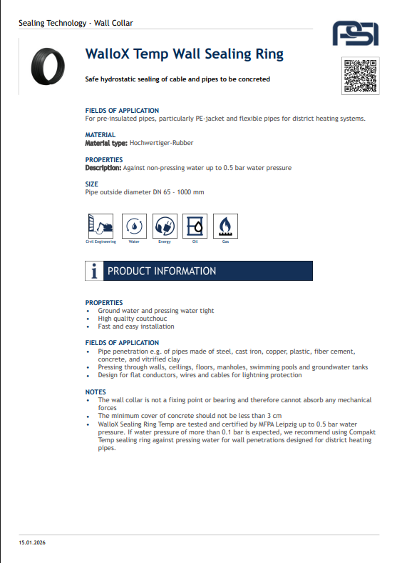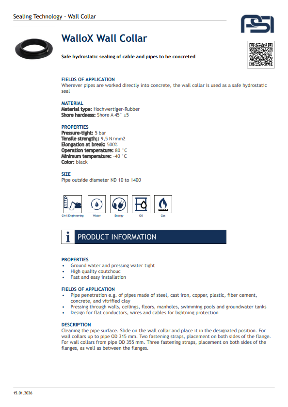 The Wallox® Wall Collar provides a reliable seal for pipes passing through concrete walls, preventing water ingress and ensuring long-term protection. Made from durable stainless steel with a high-quality elastomer seal, it offers easy installation and excellent resistance to pressure and corrosion. Available in multiple sizes to suit various pipe diameters, it’s ideal for building and civil engineering applications.